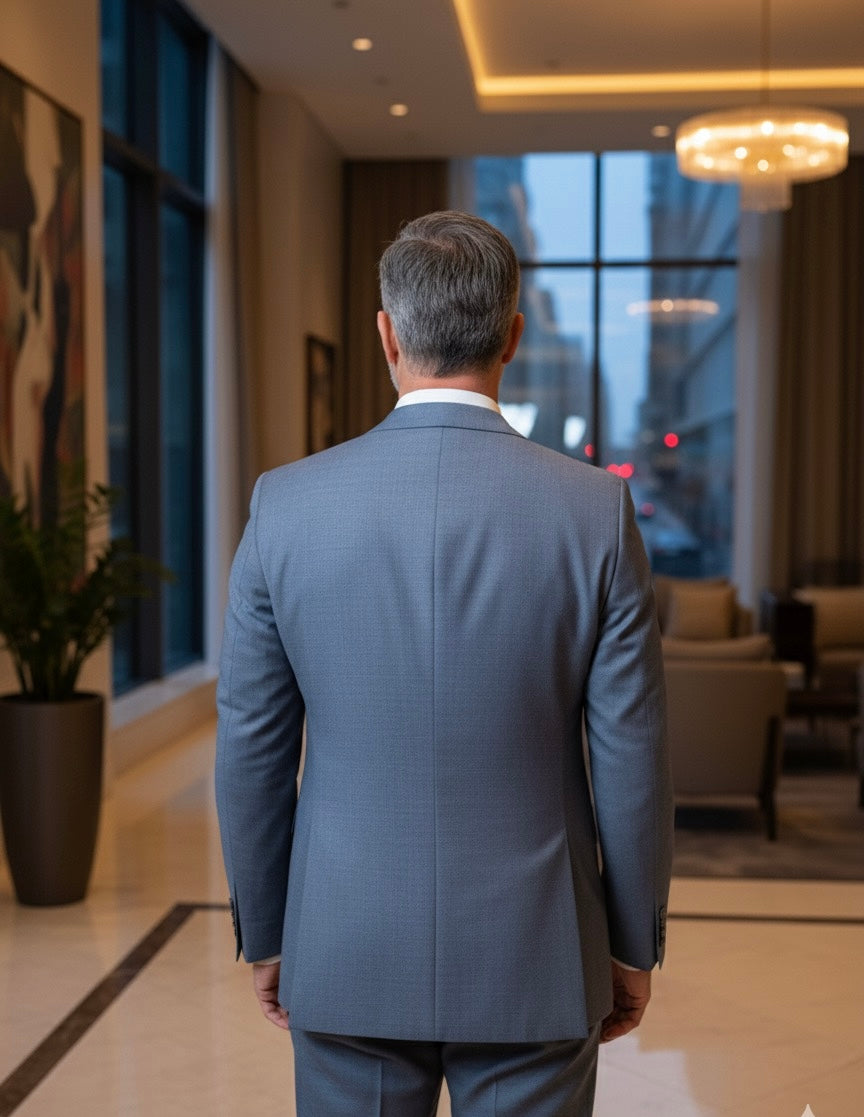 Fato em tecido tipo piquet, com corte regular fit. Confeção Portuguesa, (forro personalizado). Blazer com dois bolsos no interior, com acabamento com viés em contraste. Costura no meio das costas, com duas aberturas na parte de baixo da peça. Punhos com abertura falsa com 4 botões, tom sobre tom, lenço na lapela com uma risca do tom do fato, que dá para esconder.