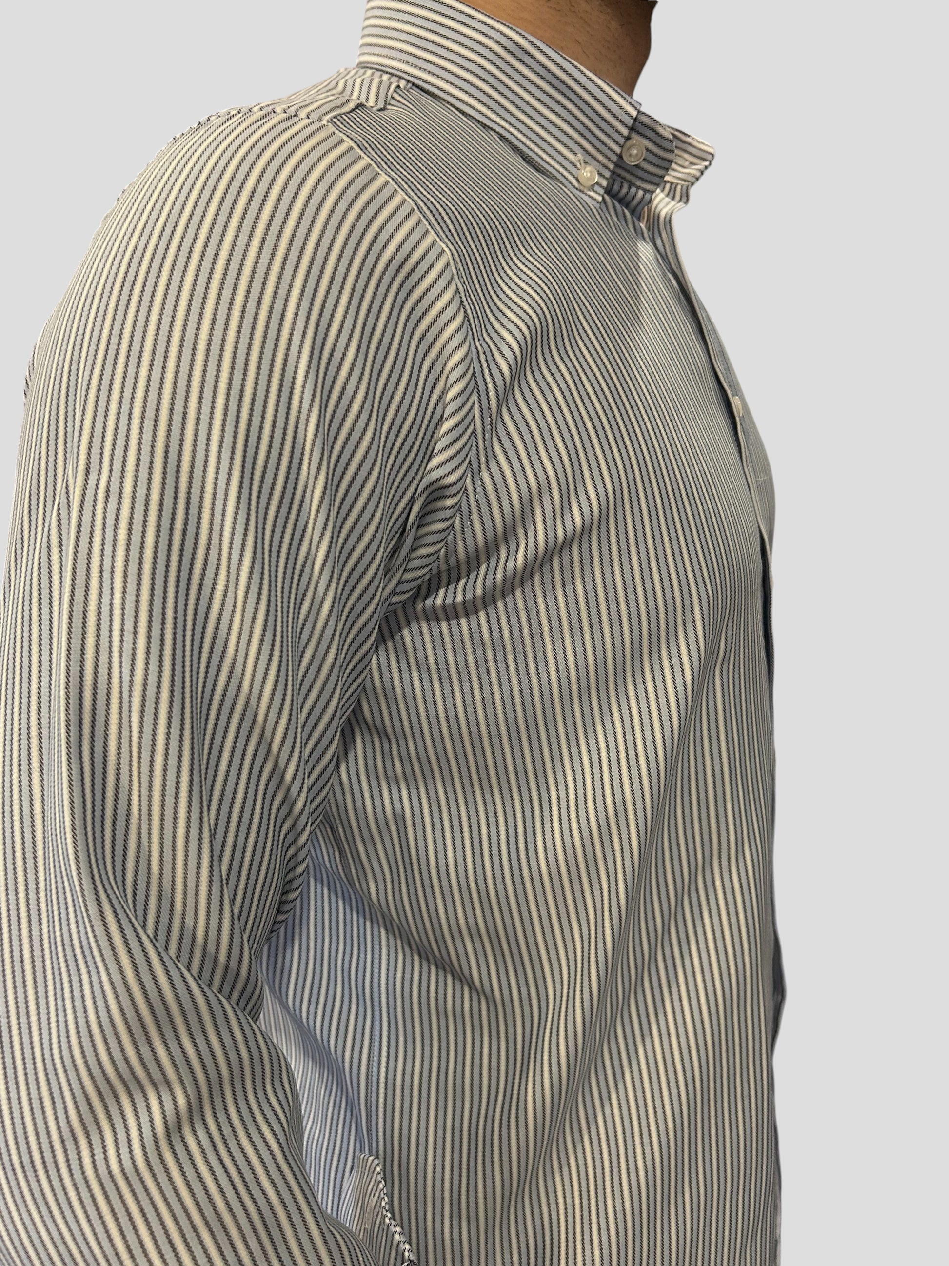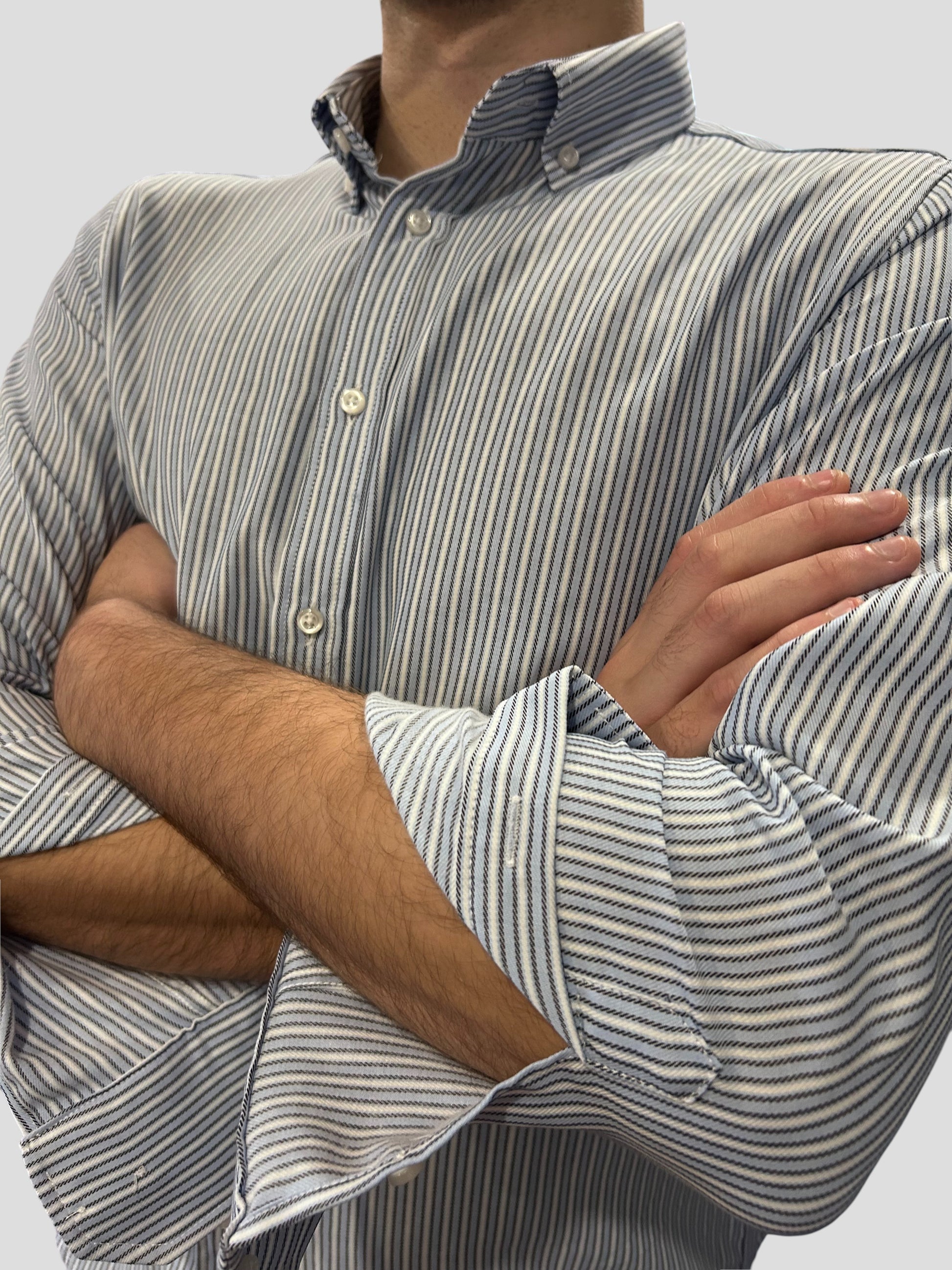 Confeccionada em Portugal com algodão puro de alta qualidade, esta camisa regular fit combina conforto e elegância em medidas equilibradas. O tecido de risca confere um toque sofisticado, ideal tanto para ambientes profissionais quanto para ocasiões casuais.