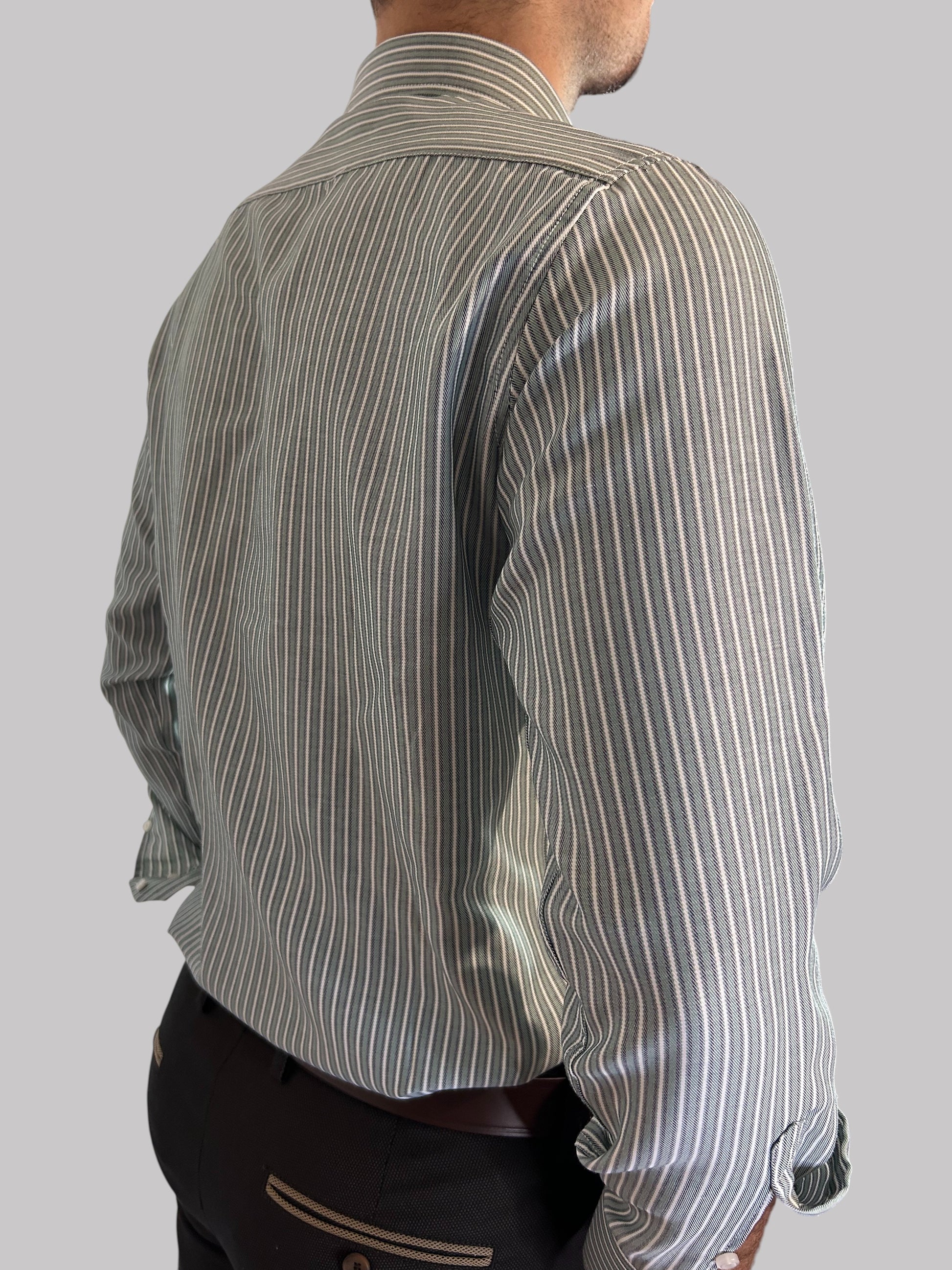 Confeccionada em Portugal com algodão puro de alta qualidade, esta camisa regular fit combina conforto e elegância em medidas equilibradas. O tecido de risca confere um toque sofisticado, ideal tanto para ambientes profissionais quanto para ocasiões casuais.